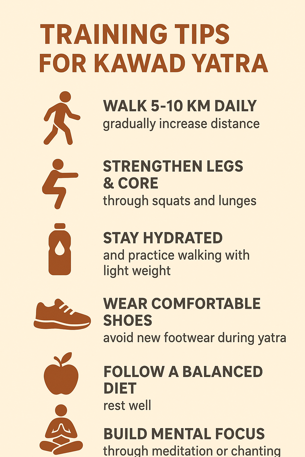 Prepare for the Kawad Yatra with regular endurance training—start walking 5–10 km daily, gradually increasing distance. Strengthen legs and core through squats and lunges. Stay hydrated and practice walking...
